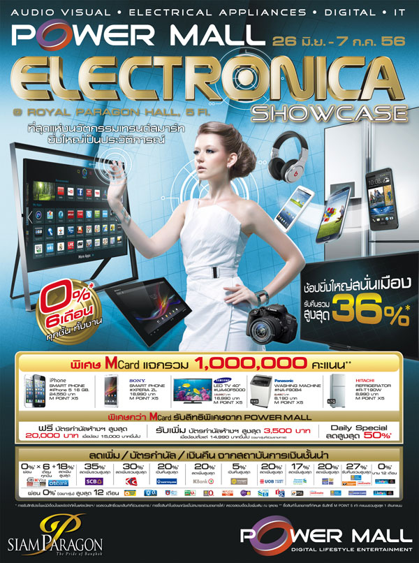POWER MALL เดอะมอลล์ กรุ๊ป ใช้งบ 65 ล้านบาท ผนึก 200 แบรนด์เครื่องไฟฟ้า เครื่องเสียง ไอที จัดเทรดโชว์ยิ่งใหญ่แห่งวงการอิเล็คทรอนิคส์ POWER MALL ELECTRONICA SHOWCASE ระหว่างวันที่ 26 มิถุนายน – 7 กรกฏาคม 2556 ณ ห้องรอยัล พารากอน ฮอลล์ ชั้น 5 สยามพารากอน โชว์ไฮไลท์สินค้านวัตกรรมใหม่อินเทรนด์แห่งปีพร้อมโปรโมชั่นลดสูงสุดเป็นประวัติการณ์ 36% ตั้งเป้ายอดขายในงานกว่า 370 ล้านบาท