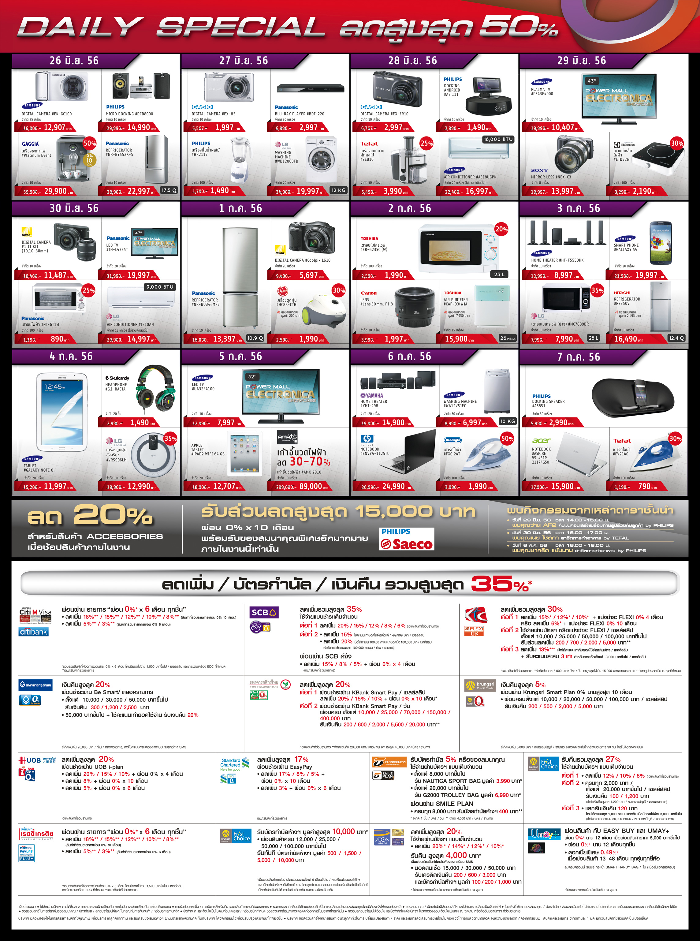 ด้านโปรโมชั่นพิเศษในงานปีนี้ยังปรับเพิ่มรูปแบบการทำรายการส่งเสริมการขายในงานให้มีความพิเศษมากขึ้น ได้แก่ การทำโปรโมชั่นรับคืนสูงสุด 36% เพื่อจูงใจและเร่งการตัดสินใจซื้อของลูกค้า เพิ่มสิทธิพิเศษให้กับลูกค้าสมาชิกบัตร M Card จะได้รับคะแนนสะสม (M Point) 5 เท่าและคะแนนรวมสูงสุด 1 ล้านคะแนน โดยเฉพาะปีนี้ในวันแรกของการจัดงาน คือ วันที่ 26 มิถุนายน 2556 เวลา 15.00 น. มีการจัดกิจกรรมพิเศษชื่อว่า “1 Day Exclusive” ให้กับลูกค้าสมาชิกบัตร M Card เท่านั้นลดสูงสุด 50% สำหรับสินค้าที่คัดสรรมา อาทิ โทรศัพท์มือถือซัมซุง กาแลคซี่โน๊ต 2 ราคา 19,990 เหลือ 15,997 บาท จำนวน 20 เครื่อง, โทรศัพท์มือถือ iPhone 4 ราคา 14,000 เหลือ 9,997 บาท จำนวน 20 เครื่อง, ทีวี LED ซัมซุง 46” ราคา 39.990 เหลือ 24,990 บาท จำนวน 50 เครื่อง, เครื่องชงกาแฟราคา 59,900 เหลือ 29,900 บาท เป็นต้น นอกจากนี้ ในแต่ละวันยังมีการจัด “สินค้าราคาพิเศษประจำวัน” หรือ “Daily Special” สำหรับลูกค้าทั่วไป อาทิ LED TV, Plasma TV, เครื่องเล่น Blu-ray, เครื่องปรับอากาศ, เครื่องฟอกอากาศ, ตู้เย็น, เครื่องครัวทันสมัย, สมาร์ท โฟนและกล้องถ่ายภาพที่ลดสูงสุดถึง 50% ในขณะที่ยังมีโปรโมชั่นผ่อนชำระ 0% 6 เดือนซึ่งเป็นรูปแบบโปรโมชั่นที่ช่วยเร่งการตัดสินใจซื้อของลูกค้าได้ดีมากในระยะหลัง ไม่รวมความพิเศษของบัตรเครดิตจาก 14 ธนาคารชั้นนำ และโปรโมชั่นพิเศษอื่นๆ อาทิ รับบัตรกำนัลห้างสรรพสินค้าสูงสุด 20,000 บาท
