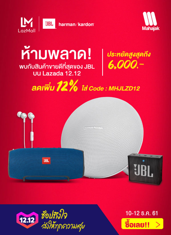 ลดกระหน่ำกับลำโพง JBL และ Harman Kardon ลดสูงสุดกว่า 60% ในวันที่ 10-12 ธันวาคม 2561 นี้ ช้อปเลยที่ https://bit.ly/2ElJ1F2
