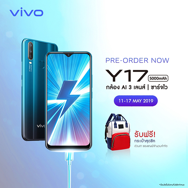 - สำหรับผู้ที่ทำการจอง Vivo Y17 สามารถรับเครื่องพร้อมของแถมในวันที่ 18 พฤษภาคม2562 เป็นต้นไป