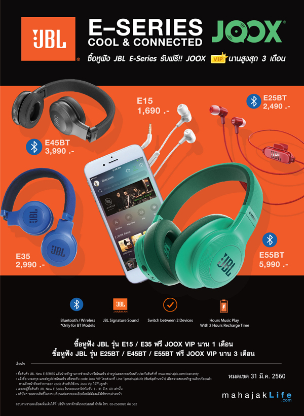 โปรโมชั่นใหม่สำหรับผู้ที่มีดนตรีในหัวใจ เมื่อซื้อสินค้า (NEW) JBL E-Series รับฟรี JOOX VIP นานสูงสุด 3 เดือน