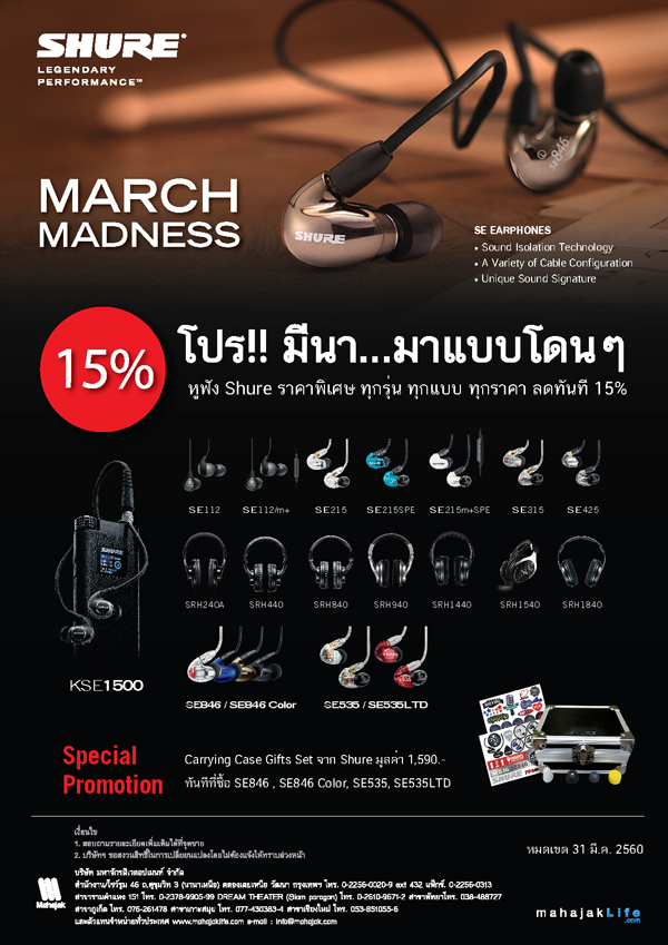 โปรโมชั่น ต้อนรับเดือนมีนาคม กับ หูฟัง Shure ราคาพิเศษ ทุกรุ่น ทุกแบบ ทุกราคา ลดทันที 15% ยังไม่พอเพียงเท่านี้ ทันทีที่ซื้อ SE846 , SE846 Color , SE535 , SE535LTD รับไปเลย Carrying Case Gifts Set กล่องใส่หูฟังสุดเท่ห์จาก Shure พร้อม Accessories สุดเจ๋งภายในกล่อง โปรโมชั่นเริ่มตั้งแต่วันนี้ – 31 มี.ค. 60 นี้เท่านั้น