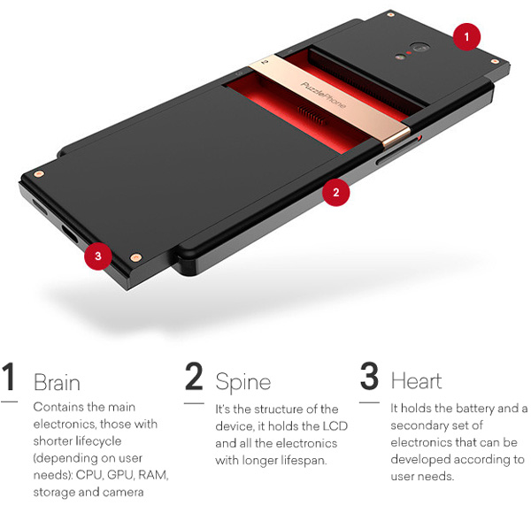 สำหรับ Brain นั้น จะเป็นส่วนที่ประกอบด้วยชิ้นส่วนหลักๆ อย่างเช่น CPU, GPU, RAM และหน่วยความจำภายใน ซึ่งส่วนนี้ ถือว่า เป็นส่วนที่ผู้ใช้ต้องการอัปเกรดมากที่สุด ถัดมาคือ Spine (กระดูกสันหลัง) ประกอบด้วย หน้าจอแสดงผล, ลำโพง และไมโครโฟน สุดท้ายเป็น Heart (หัวใจ) ประกอบด้วย แบตเตอรี่ ซึ่งถือว่า เป็นปัจจัยสำคัญของสมาร์ทโฟนเลยนั่นเอง