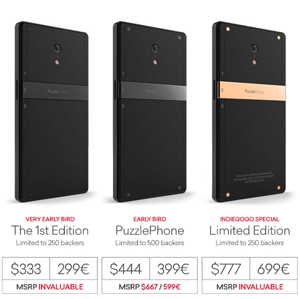 สำหรับราคาของ PuzzlePhone แบ่งออกเป็น 3 รุ่นด้วยกัน ได้แก่