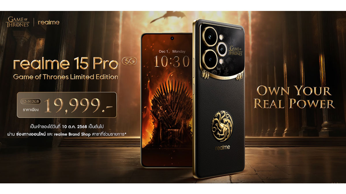 เปิดตัว “realme 15 Pro Game of Thrones Limited Edition” ปลดล็อกพลังของคนรุ่นใหม่ ภายใต้คอนเซ็ปต์ Own Your Real Power! แฟน ๆ ชาวไทยเตรียมเป็นเจ้าของในราคา 19,999 บาท