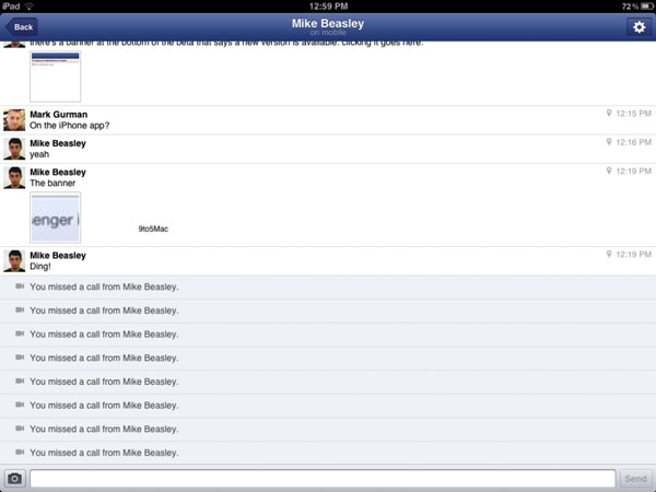 เว็บไซต์ 9to5mac ได้เปิดเผยว่า ขณะนี้ Facebook Messenger for iPad กำลังถูกทดสอบบนเซิฟเวอร์ภายในของ Facebook ซึ่งนอกจากจะสามารถสนทนาแบบตัวต่อตัวได้แล้ว ยังสามารถสนทนาแบบกลุ่มได้ด้วยเช่นกัน