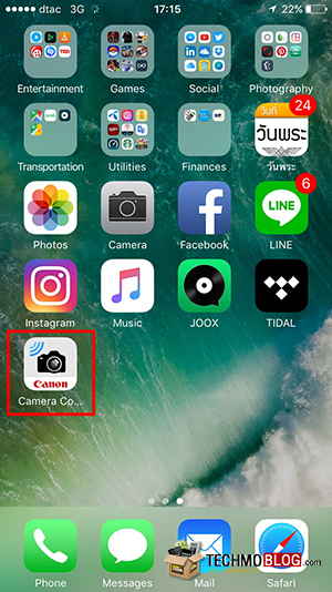 เมื่อลงทะเบียนเสร็จสิ้น พร้อมทั้งเชื่อมต่อ Canon EOS M10 กับบัญชี Facebook ของผู้ใช้แล้ว จะปรากฏไอคอน Facebook ขึ้นมาดังภาพ ให้กดเข้าไป