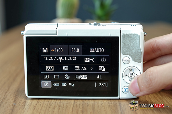 เมื่อเข้ามาสู่โหมด M แล้วก็จะพบกับหน้าจอที่มีเมนูต่างๆ ให้ปรับแต่งมากกว่าโหมดกึ่งอัตโนมัติแบบอื่นๆ โดยการปรับค่าต่างๆ ค่อนข้างสะดวก เพราะสามารถใช้นิ้วสัมผัสไปที่ช่องนั้นๆ พร้อมทั้งหมุนวงแหวนปรับได้ทันที