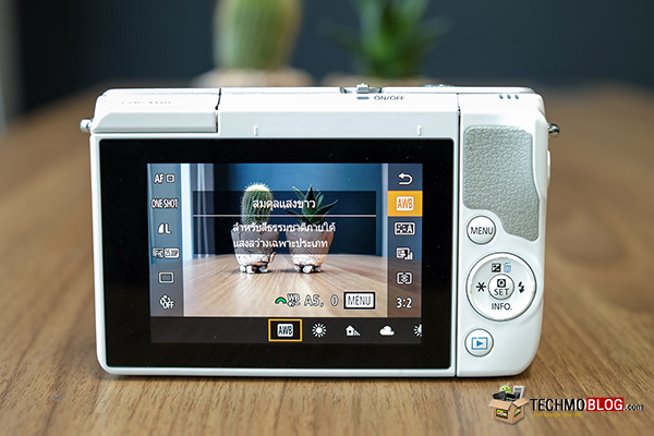ถ้าใครเคยชินกับการใช้งานกล้อง DSLR คงจะคุ้นเคยกับหน้าจอเช่นนี้เป็นอย่างดี เพราะหน้าจอนี้คือหน้าจอแสดงการตั้งค่าทุกอย่างของกล้อง ก่อนจะทำการถ่ายภาพ ซึ่งสามารถเปลี่ยนรูปแบบหน้าจอได้ด้วยการกดปุ่ม INFO ที่วงแหวนด้านขวา