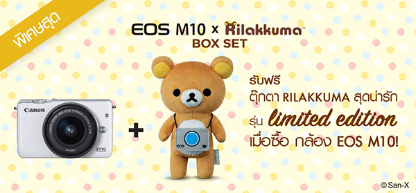 สำหรับ Canon EOS M10 กล้อง Mirrorless ยอดฮิตในขณะนี้มีเวอร์ชันใหม่ออกวางจำหน่าย คือ Canon EOS M10 X Rilakkuma Box Set ซึ่งเป็นแพ็กเกจที่มาพร้อมกล้อง และตุ๊กตา Rilakkuma รุ่น Limited Edition ลิขสิทธิ์แท้จาก San-X ประเทศญี่ปุ่น และทาง Canon ยังจัดแคมเปญหนึ่งอย่างเพื่อให้สอดรับกับแพ็กเกจ Rilakkuma ของ Canon EOS M10 ที่เป็นกล้องพกพาง่าย ถ่ายสะดวก พร้อมตุ๊กตาหมีสุดน่ารัก โดยแคมเปญดังกล่าว คือ Toytravel (Nui-Dori) ที่เป็นศิลปะการถ่ายภาพของเล่น โดยการให้ของเล่นเลียนแบบชีวิตจริงของมนุษย์ ซึ่งท่านผู้อ่านสามารถติดตามรายละเอียดเพิ่มเติม และร่วมสนุกกับแคมเปญดังกล่าวได้ที่ Canon-Asia และรับชมวิดีโอการถ่ายภาพ Rilakkuma ในรูปแบบ Toytravel สุดน่ารักได้ที่ CANON EOS M10 x Rilakkuma™ - เพื่อนซี๊คนโปรดของคุณ