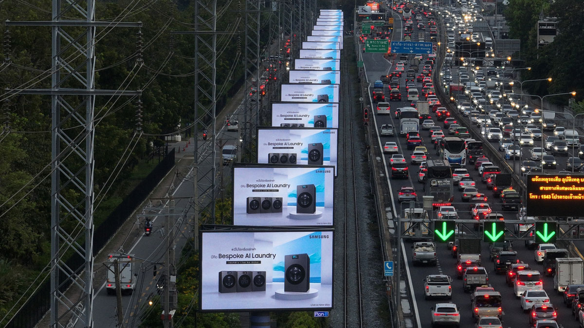 การใช้ DOOH ของซัมซุงในแคมเปญนี้ ครอบคลุมพื้นที่ทั่วกรุงเทพฯ ทั้งเส้นทางหลักใจกลางเมืองอย่างสาทร พระราม 4 ไปจนถึงป้ายดิจิทัลไฮไลต์ ที่เรียงต่อกันถึง 37 ต้น รวมความยาวกว่า 2.5 กิโลเมตร และจอบนรถไฟฟ้า BTS การสื่อสารครั้งนี้ไม่เพียงสร้างการรับรู้แต่คือการเข้าถึงไลฟ์สไตล์จริงของคนเมืองที่เต็มไปด้วยภาระหน้าที่และกิจวัตรประจำวันที่แสนวุ่นวาย เพราะแค่ต้องเผชิญกับงานออฟฟิศ การเดินทาง หรือรถติดบนท้องถนน ก็ใช้พลังไปเกือบหมดแล้ว ซัมซุงจึงหยิบอินไซต์นี้มาตอกย้ำว่า ทุกบ้านควรมีผู้ช่วยอัจฉริยะอย่างเครื่องซัก–อบ Bespoke AI Laundry ที่มาพร้อมนวัตกรรม AI ทำให้งานซักผ้าง่ายขึ้น และช่วยคืนเวลาให้กับชีวิตประจำวัน