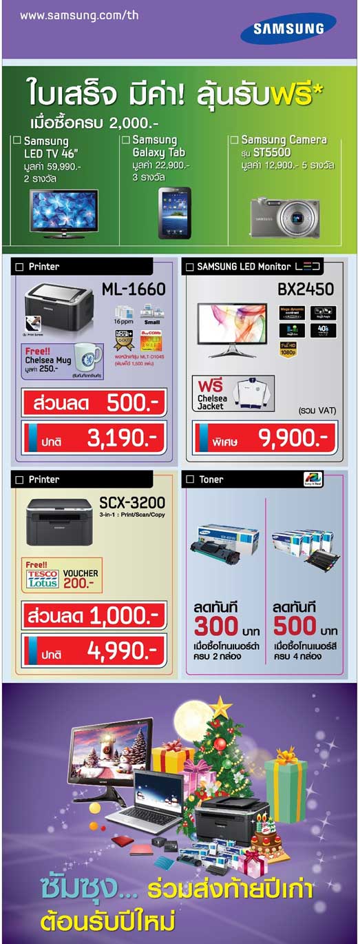 ทัพสินค้าไอทีและเครื่องใช้ไฟฟ้าราคาสุดพิเศษ : ครั้งแรกของซัมซุงโน้ตบุ๊ครุ่น R439 กับราคาสุดเซอร์ไพรส์เพียง 14,900 บาท จากปกติ 16,900 บาท พร้อมของสมนาคุณอีกมากมายและ เน็ตบุ๊ครุ่นล่าสุด NF208 ในราคาเพียง 11,900 บาท โดยสามารถผ่อนชำระ 0% นานถึง 6 เดือน นอกจากนี้ยังมี ซัมซุง เลเซอร์ พรินเตอร์รุ่น ML-1660 ในราคาที่สามารถเป็นเจ้าของง่ายๆ เพียง 2,690 บาท จากปกติ 3,190 บาท และรุ่น SCX-3200 เพียง 3,990 บาท จากปกติ 4,990 บาท พร้อมของสมนาคุณมากมาย