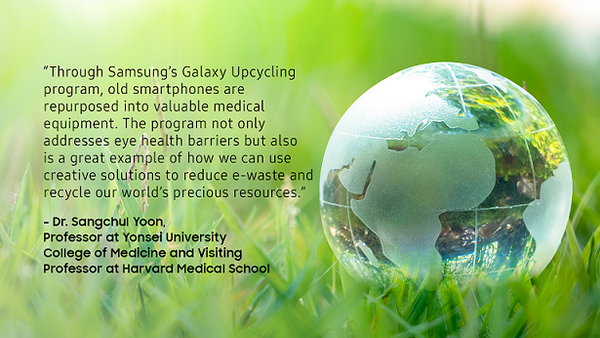 “โปรแกรม Galaxy Upcycling จากซัมซุง ได้เปลี่ยนสมาร์ทโฟนให้กลายเป็นอุปกรณ์ทางการแพทย์ที่มีค่า ซึ่งนอกจากแก้ปัญหาเรื่องการดูแลสุขภาพดวงตาแล้ว โปรแกรมนี้ยังเป็นตัวอย่างที่ดีของซัมซุงในการคิดค้นวิธีการที่สร้างสรรค์เพื่อลดขยะอิเลคโทรนิกส์และรีไซเคิลทรัพยากรอันมีค่าของโลก” ดร.เซ็งชอล ยูน ศาสตราจารย์ประจำวิทยาลัยแพทยศาสตร์ มหาวิทยาลัยยอนเซ และศาสตราจารย์รับเชิญที่โรงเรียนแพทย์ฮาร์วาร์ด กล่าว