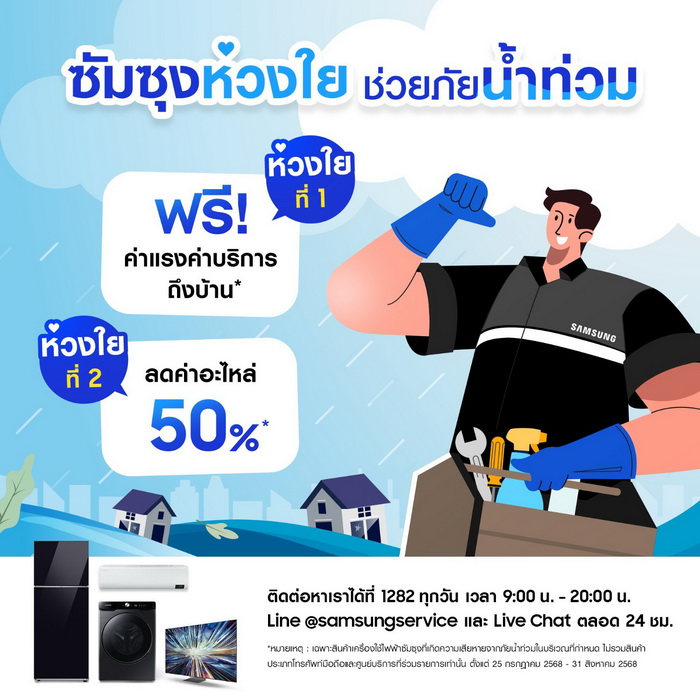 บริการนี้ครอบคลุมเฉพาะเครื่องใช้ไฟฟ้าภายในบ้านของซัมซุงที่ได้รับความเสียหายจากอุทกภัยในพื้นที่ที่ประกาศเป็นเขตภัยพิบัติ ตั้งแต่วันที่ 25 กรกฎาคม 2568 ถึง 31 สิงหาคม 2568 และสามารถติดต่อรับบริการได้ที่เบอร์ 1282 ทุกวันเวลา 9.00–20.00 น. หรือทาง Line: @samsungservice และ Live Chat ตลอด 24 ชั่วโมง