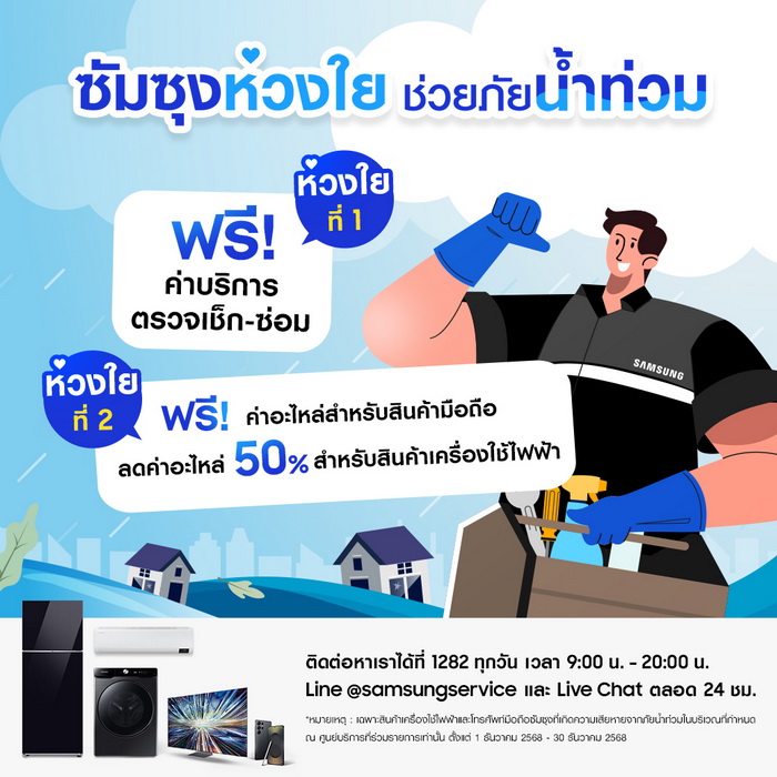- ฟรีค่าบริการตรวจและซ่อม สำหรับสมาร์ทโฟน* และเครื่องใช้ไฟฟ้าของซัมซุงที่ได้รับความเสียหายจากน้ำท่วม