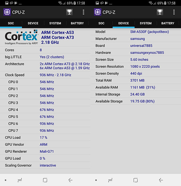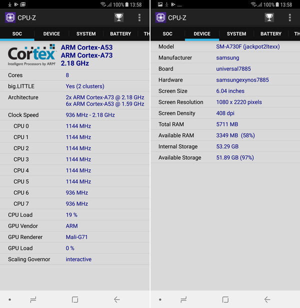 มาทดสอบประสิทธิภาพด้านการประมวลผลกันบ้าง โดย Samsung Galaxy A8 (2018) มาพร้อมกับชิปเซ็ต Exynos 7885 แบบ Octa-Core Processor ความเร็ว 2.2 GHz, หน่วยประมวลผลภาพ Mali-G71 GPU, หน่วยความจำ RAM ขนาด 4 GB และหน่วยความจำภายในตัวเครื่องขนาด 32 GB