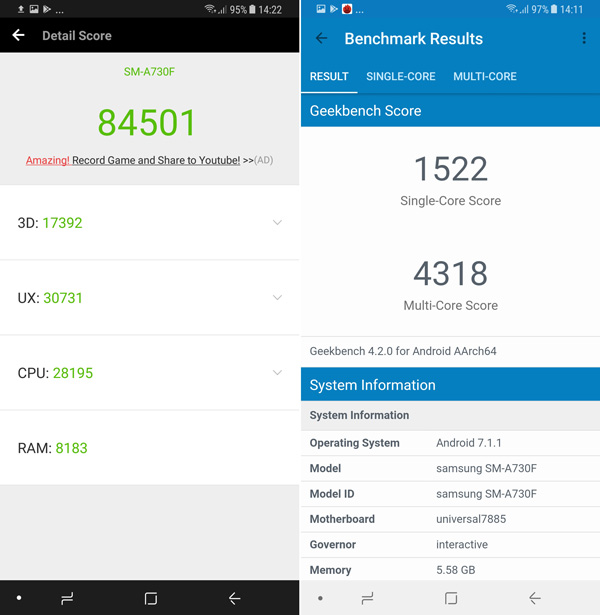 ส่วนการทดสอบบน Samsung Galaxy A8+ (2018) ด้วยโปรแกรม AnTuTu ทำได้ 84,501 คะแนน ส่วนการทดสอบด้วยโปรแกรม Geekbench 4 ทำได้ 1,522 คะแนน และ 4,318 คะแนน สำหรับการทดสอบแบบ Single-Core และ Multi-Core ตามลำดับ