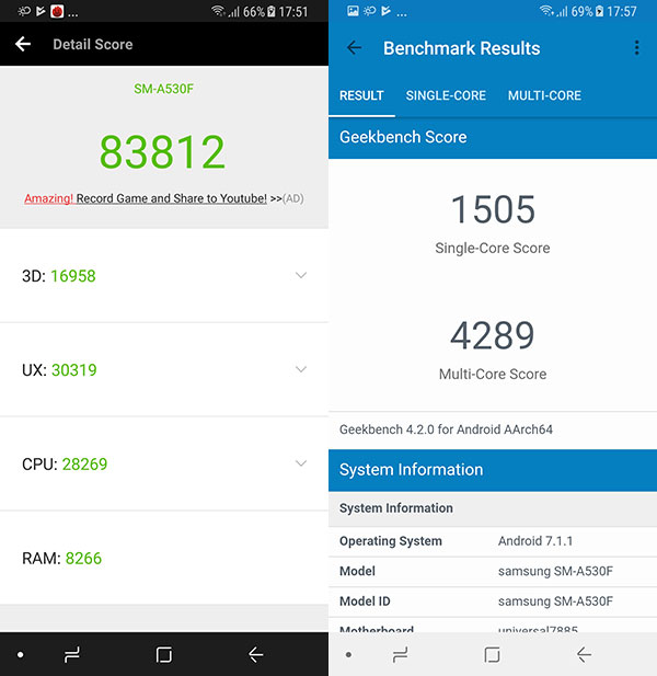 สำหรับผลการทดสอบ Benchmark บน Samsung Galaxy A8 (2018) ด้วยโปรแกรม AnTuTu ทำได้ 83,812 คะแนน ส่วนการทดสอบด้วยโปรแกรม Geekbench 4 ทำได้ 1,505 คะแนน และ 4,289 คะแนน สำหรับการทดสอบแบบ Single-Core และ Multi-Core ตามลำดับ