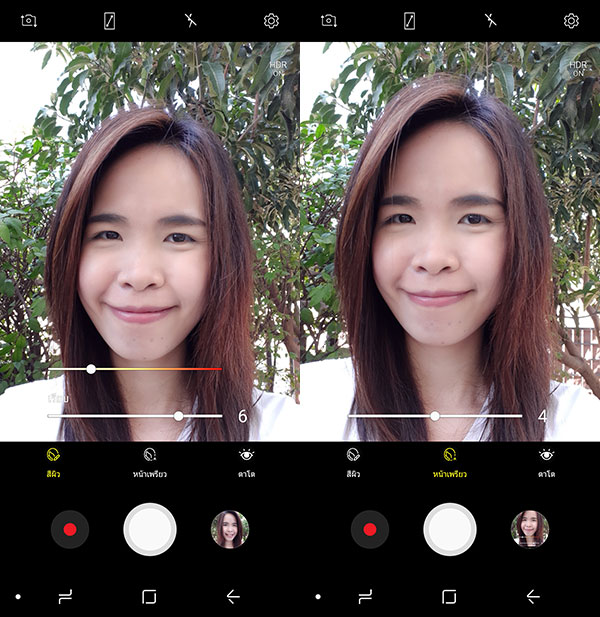 แต่ถ้าหากเป็นโหมดถ่ายภาพเซลฟี่ปกติ จะสามารถปรับใบหน้าได้ 3 แบบ ได้แก่ สีผิว, หน้าเพรียว และตาโต สูงสุดที่ 8 ระดับ
