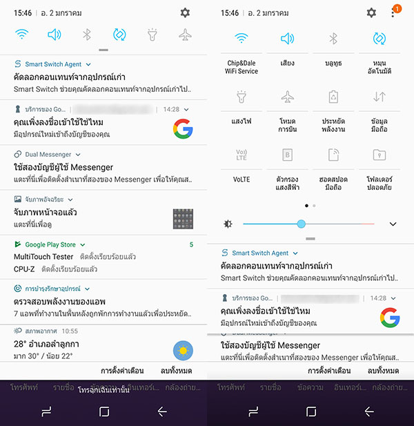 Toggle Switch รวมคีย์ลัดสำหรับการใช้งาน ทำให้สามารถตั้งค่าการใช้งานในด้านต่าง ๆ ได้ง่ายขึ้นและสะดวกมากขึ้น ส่วนแถบล่างจะเป็น Notification Center แสดงการแจ้งเตือนทั้งหมด ไม่ว่าจะเป็น การติดตั้งแอปพลิเคชัน, อีเมล, ข้อความ และอื่น ๆ