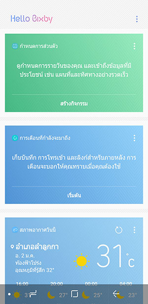 จากปัดจากซ้ายไปขวาในหน้า Home Screen จะเข้าสู่โหมด Bixby Home ซึ่งเป็นฟีเจอร์เดียวกับที่ใช้บนมือถือรุ่นเรือธงอย่าง Samsung Galaxy S8 และ Samsung Galaxy Note8 ซึ่ง Bixby Home จะรวมการแจ้งเตือนต่าง ๆ จากแอปพลิเคชันที่รองรับ เช่น สภาพอากาศ, ข่าวสาร, YouTube รวมถึง Samsung Health โดยที่ผู้ใช้ไม่ต้องเปิดดูทีละแอปฯ นั่นเอง