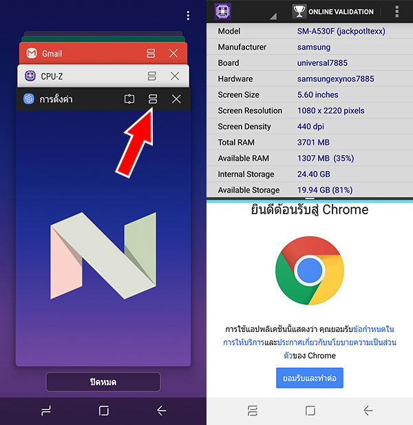 ในเมนู Recent Apps นั้น นอกจากจะสามารถสลับไปใช้งานแอปพลิเคชันอื่นได้แล้ว ยังมีสัญลักษณ์ของ Multi-Window หรือการเปิดใช้งาน 2 แอปฯ พร้อมกันในหน้าจอเดียว ซึ่งแอปฯ ไหนรองรับฟีเจอร์ Multi-Window บ้างนั้น ให้สังเกตที่ไอคอนมุมบนขวา (ตามภาพ)