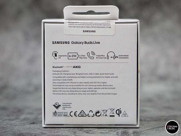 ด้านหลังระบุฟีเจอร์หลัก ๆ ของหูฟังไร้สาย Galaxy Buds Live ซึ่งได้แก่ ดีไซน์ที่สวมใส่กระชับ, รองรับการใช้งานได้ยาวนาน 6-21 ชั่วโมง, ไมโครโฟน 3 ตัวเพื่อให้ได้คุณภาพเสียงที่ดีที่สุด และรองรับระบบตัดเสียงรบกวน ANC (Active Noise Cancellation)