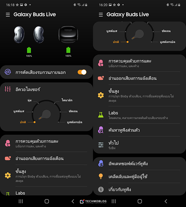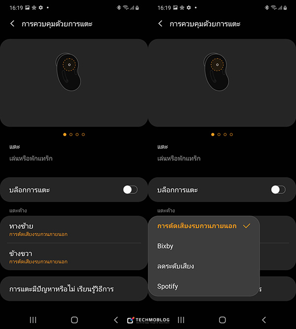 ส่วนการเปิด-ปิดโหมด ANC นอกจากจะสามารถทำได้ผ่านแอปพลิเคชันแล้ว ยังสามารถแตะค้างที่ตัวหูฟังได้ หรือเลือกเป็นการตั้งค่าอย่างอื่น เช่น เรียก Bixby, เพิ่ม-ลดระดับเสียง หรือเปิด Spotify