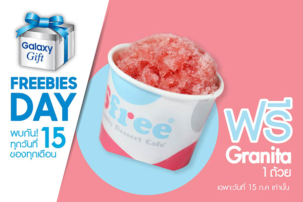 กรุงเทพฯ –14 กรกฏาคม 2558 – ซัมซุงร่วมกับ Sfree ร้านไอศครีม Sugar Free และพาเฟ่ต์สัญชาติญี่ปุ่น จัด Freebie Day ประจำเดือนกรกฏาคมรับหน้าฝน ด้วยการมอบสิทธิพิเศษให้ผู้ใช้ซัมซุง กาแลคซี่ทุกรุ่น ผ่านแอพพลิเคชัน Galaxy Gift *รับฟรี Granita มูลค่า 49 บาทจำนวน 1 ถ้วย รับสิทธิ์ได้ง่ายๆ เพียงเข้าแอพพลิเคชั่น Galaxy Gift กดรับสิทธิ์ แสดงรหัสที่ร้าน Sfree ทุกสาขา รับสิทธิ์ได้เฉพาะวันที่ 15 กรกฎาคมนี้ วันเดียวเท่านั้น