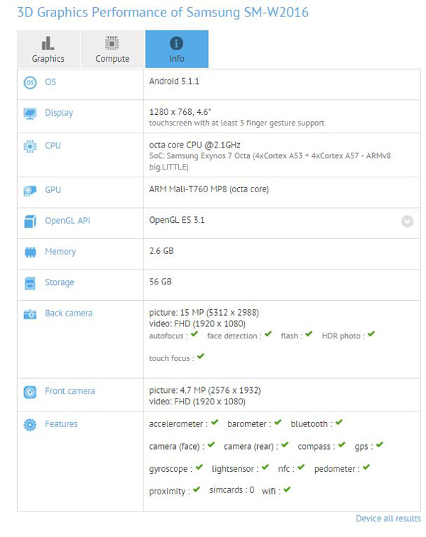 โดยผลการทดสอบ GFXBench กับสมาร์ทโฟนโมเดล SM-W2016 ที่คาดว่า น่าจะเป็น Samsung Galaxy Golden 3 นั้น ได้เผยว่า สเปคของ Samsun Galaxy Golden นั้น แทบจะเทียบเท่า Galaxy S6 เลยทีเดียว โดยคาดว่า Samsung Galaxy Golden 3 จะมาพร้อมกับหน้าจอขนาด 4.6 นิ้ว ความละเอียด 1280 x 768 พิกเซล, ชิปเซ็ต Exynos 7420 แบบ Octa-Core Processor, หน่วยความจำ RAM ขนาด 3 GB, หน่วยความจำภายในขนาด 64 GB, กล้องด้านหน้า ความละเอียด 5 ล้านพิกเซล, กล้องด้านหลัง ความละเอียด 16 ล้านพิกเซล และรัน Android 5.1.1 (Lollipop)