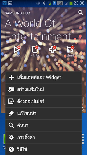 โดยวิธีการเพิ่ม แอพพลิเคชั่น และ Widget นั้น สามารถทำได้ด้วยการ แตะที่ปุ่มเมนู ซึ่งเป็นปุ่มควบคุมการทำงานแบบสัมผัสด้านซ้ายสุด จะปรากฏเมนูตามภาพด้านบน นอกจากนี้ ยังสามารถเลือกวอลเปเปอร์ และเข้าสู่หน้าการตั้งค่า (Settings) ได้จากส่วนนี้ด้วยเช่นกัน