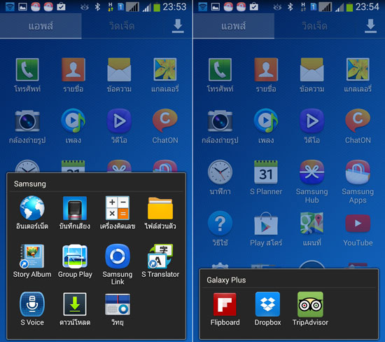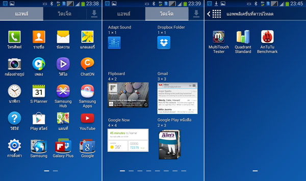 App Drawer แหล่งเก็บแอพพลิเคชั่นทั้งหมด จะประกอบไปด้วย 3 ส่วนด้วยกันครับ ได้แก่ แอพพลิเคชั่นรวม, Widget และแอพพลิเคชั่นที่ดาวน์โหลด