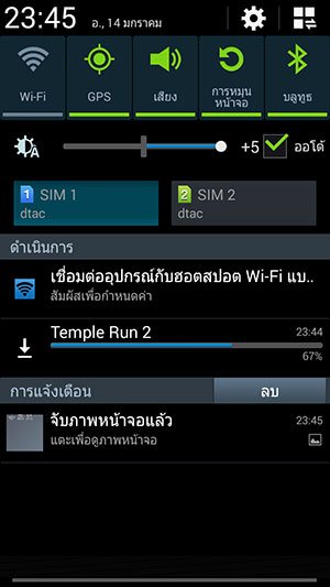 การลากจากด้านบนหน้าจอมาด้านล่าง จะเป็นการเข้าสู่เมนูการแจ้งเตือน หรือ Notification นั่นเอง ซึ่งในส่วนนี้ สามารถตั้งค่าการใช้งานต่างๆ ได้อย่างมากมาย ไม่ว่าจะเป็น การเปิด-ปิด Wi-Fi, GPS, เสียง, การหมุนหน้าจอ, Bluetooth และอื่นๆ นอกจากนี้ ยังสามารถปรับความสว่างของหน้าจอได้ และเลือกใช้งานซิมการ์ดที่ต้องการ