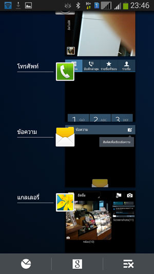 ส่วนการกดปุ่ม Home ค้างไว้ จะเป็นการเข้าสู่ฟังก์ชัน Multitasking ครับ สามารถเลือกเปิดแอพพลิเคชั่นที่เคยเปิดใช้งานไปแล้ว ได้จากส่วนนี้ หรือ ลบแอพพลิเคชั่นที่ไม่ใช้งาน ด้วยการปัดไปด้านซ้าย เพื่อเป็นการเพิ่มหน่วยความจำ RAM ให้กับตัวเครื่องนั่นเอง