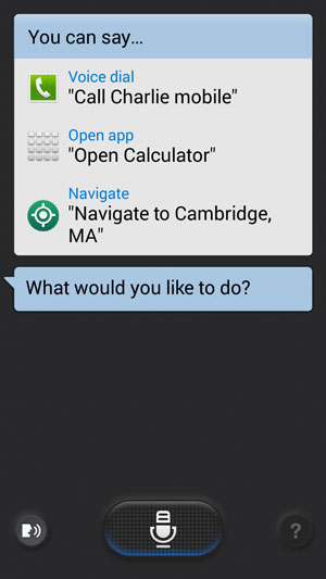 แต่ถ้าเป็นการคลิกที่ปุ่ม Home 2 ครั้ง จะเป็น S Voice การสั่งการด้วยเสียง ซึ่งมีวิธีการใช้งานคล้าย Siri บน iOS นั่นเอง โดยผู้ใช้สามารถสร้างคำสั่งได้หลายประเภท ไม่ว่าจะเป็น สั่งให้เปิดเพลง, สร้างตารางนัดหมาย, เปิดแอพพลิเคชั่น และอื่นๆ อีกมากมาย