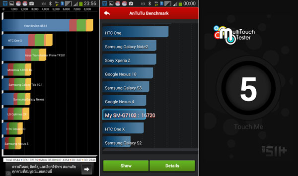 ปิดท้ายด้วย การทดสอบ Benchmark บน Samsung Galaxy Grand 2 กันบ้าง โดยผลการทดสอบด้วยโปรแกรม Quadrant วัดความเร็วในการทำงานของ CPU และกราฟฟิค อยู่ที่ 8544 คะแนน และ AnTuTu ทดสอบ CPU, 2D & 3D graphics, SD card และ Database อยู่ที่ 16720 คะแนน ส่วนมัลติทัช รองรับที่ 5 จุดครับ