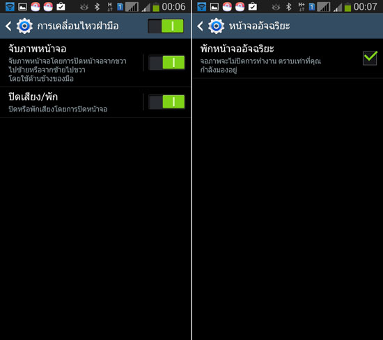 ส่วนการควบคุมการทำงานด้วยท่าทางและการเคลื่อนไหว บน Samsung Galaxy Grand 2 ก็รองรับด้วยเช่นกัน โดยสามารถจับภาพหน้าจอด้วยการใช้ด้านข้างของมือ ปัดหน้าจอไปทางซ้ายหรือขวา นอกจากนี้ ยังมี พักหน้าจออัจฉริยะ โดยจอภาพจะไม่ปิดการทำงาน ถ้าหากผู้ใช้ยังคงมองหน้าจออยู่ ซึ่งเมื่อเปิดใช้งาน จะมีไอคอนรูปลูกตา ปรากฏที่ด้านบนครับ