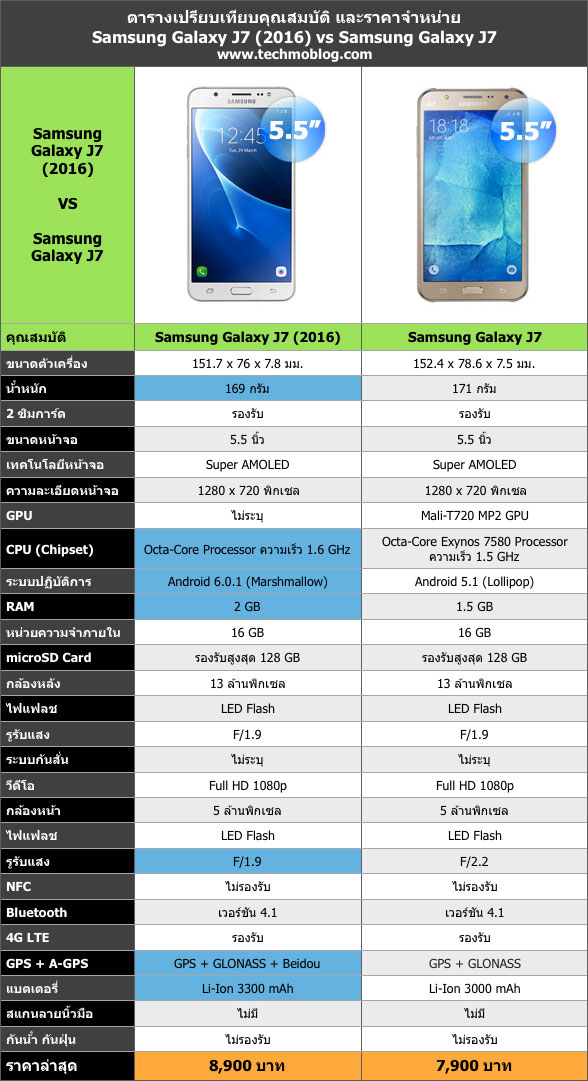 ได้ฤกษ์วางจำหน่ายอย่างเป็นทางการแล้ววันนี้ สำหรับ Samsung Galaxy J7 Version 2 (2016) หรือ Samsung Galaxy J7 (2016) ซึ่งถือว่า เป็นรุ่นสานต่อของ Samsung Galaxy J7 ที่เปิดตัวเมื่อปีที่ผ่านมา และเพื่อความไม่สับสนในการเรียกชื่อ ทางซัมซุง จึงได้เพิ่มคำว่า Version 2 (2016) เข้ามา เพื่อสื่อว่าเป็นรุ่นอัปเกรดนั่นเอง โดยจุดเด่นของสมาร์ทโฟนในซีรี่ส์ Galaxy J นั่นก็คือ มาพร้อมกับไฟแฟลชที่กล้องด้านหน้า ซึ่งรุ่นสานต่อนี้ จะอัปเกรดในด้านใดบ้างเมื่อเทียบกับรุ่นพี่ วันนี้ ทีมงาน techmoblog ได้ทำบทความเปรียบเทียบมาให้ชมกันแล้ว