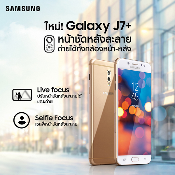 กรุงเทพฯ (18 กันยายน 2560) – ในขณะที่ซัมซุง กาแลคซี่ โน้ต 8 กำลังเป็นกระแสอย่างแรงแซงทุกโค้ง ซัมซุง ไม่รอช้าขอใส่เกียร์เดินหน้าเตรียมลอนช์ “ซัมซุง กาแลคซี่ เจ 7 พลัส” สมาร์ทโฟนกล้องคู่ราคาสุดคุ้ม เอาใจคนชอบถ่ายภาพด้วยฟีเจอร์ Selfie Focus และ Live Focus ให้คุณถ่ายภาพแบบหน้าชัด หลังละลายได้ทั้งกล้องหน้าและกล้องหลัง แถมมีเซอร์ไพรส์เพราะงานนี้มีพรีเซนเตอร์สุดว้าวทั้งชาย-หญิง จะเป็นใครนั้นและจะเด็ดแค่ไหนรอชม TVC พร้อมกันได้ 22 กันยายนนี้ทั่วประเทศ