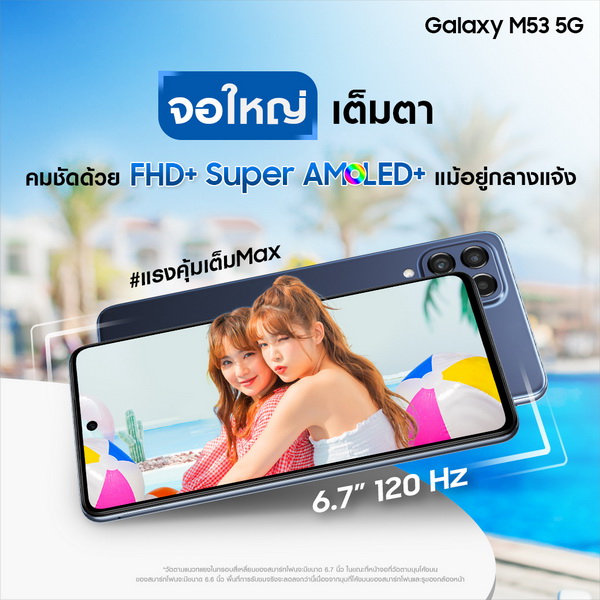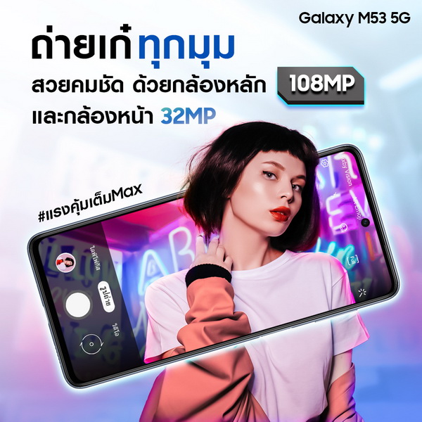 ซัมซุงเปิดตัว Galaxy M53 5G สมาร์ทโฟนระดับกลางสุดคุ้มรุ่นล่าสุด จัดเต็มครบทุกการใช้งานในชีวิตประจำวัน ทั้งกล้องคุณภาพแน่นคมชัดครบทุกเลนส์ ชิปเซ็ตเร็วแรงใช้งานได้อย่างไหลลื่น หน้าจอสีสดใสใหญ่เต็มตา และแบตเตอรี่แบบจุใจ พร้อมตัวเลือกโทนสีเรียบล้ำทันสมัย กับดีลสุดพิเศษเมื่อสั่งซื้อ Galaxy M53 5G ผ่านทาง samsung.com, Lazada, Shopee และ JD Central ในราคา 12,499 บาท เฉพาะวันที่ 1 – 15 มิถุนายน 2565