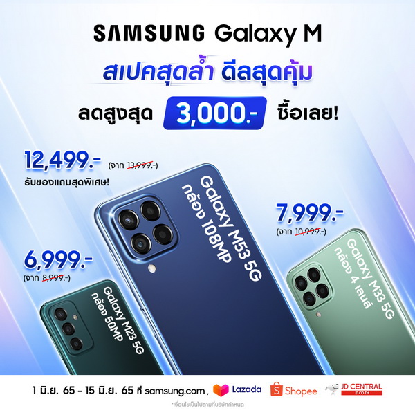 พิเศษกับดีลสุดคุ้ม เมื่อซื้อสมาร์ทโฟน Galaxy M Series ระหว่างวันที่ 1 – 15 มิถุนายน 2565 ผ่านทาง samsung.com, Lazada, Shopee และ JD Central รับส่วนลดสูงสุด 3,000 บาท ประกอบด้วย