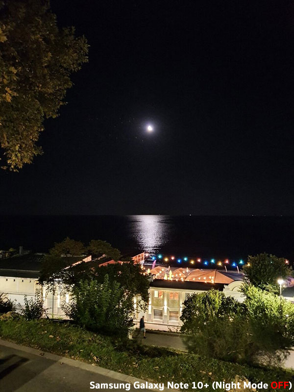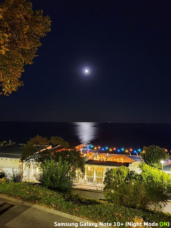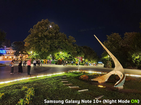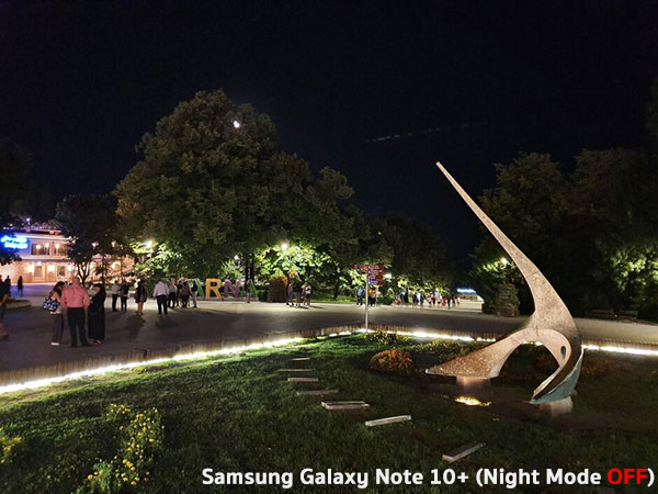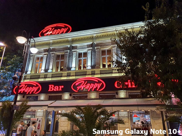 ปิดท้ายด้วยการทดสอบถ่ายภาพแสงไฟถนนในยามค่ำคืน ซึ่งการทดสอบนี้ถือว่า Samsung Galaxy Note 10+ ทำได้ดีทั้งการเปิดและปิด Night Mode เลยก็ว่าได้ เพราะเก็บสีสันของภาพถ่ายได้อย่างครบถ้วน ในขณะที่ Huawei P30 Pro แม้ภาพที่ได้จะสว่างเช่นกัน แต่สีสันที่ได้กลับซีดและจืดชืด ทำให้ภาพขาดชีวิตชีวา ส่วน Pixel สีสันที่ได้ดูเกินความเป็นจริง ด้าน iPhone XS Max ภาพที่ได้มืดกว่าภาพจากรุ่นอื่น ๆ