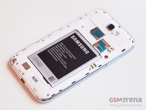 ฝาหลังของ Samsung Galaxy Note II (Samsung Galaxy Note 2) สามารถแกะได้ครับ หมดห่วงเรื่องปัญหาแบตเตอรี่หมด เพราะสามารถเปลี่ยนแบตเตอรี่สำรองได้ ซึ่งภายในนั้น ประกอบด้วยช่องสำหรับ microSIM, ช่อง microSD และแบตเตอรี่ขนาด 3100 mAh