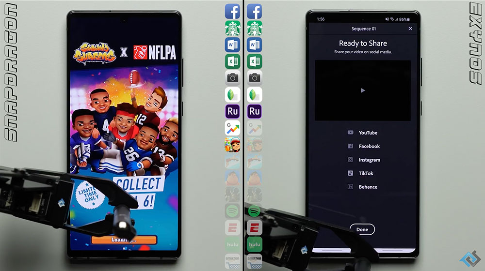 เริ่มการทดสอบแรก จะเห็นว่า ทั้ง 2 ชิปเซ็ตประมวลผลได้เร็วสูสีกันอย่างมาก จนเริ่มมาเห็นความแตกต่างช่วงการเปิดแอปพลิเคชัน Snapseed ที่ชิปเซ็ต Qualcomm Snapdragon 865+ ประมวลผลได้ไวกว่า รวมถึงความเร็วในการเรนเดอร์ของแอปฯ Adobe Rush for Samsung จบการทดสอบรอบแรก ชิปเซ็ต Qualcomm Snapdragon 865+ ทำเวลาได้ดีกว่า Exynos 990 อยู่ที่ 01.59.77 นาที ส่วน Exynos 990 ใช้เวลาไป 02.13.90 นาที