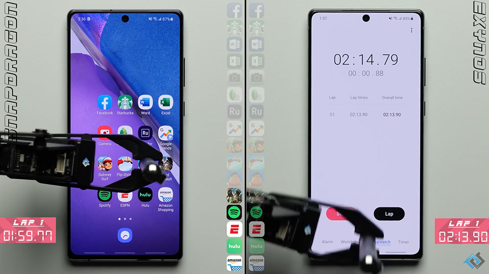 สำหรับ Samsung Galaxy Note 20 รุ่นที่นำมาทดสอบนี้ มาพร้อมกับ RAM 8 GB และทำงานบนระบบปฏิบัติการ Android 10 ต่างกันตรงชิปเซ็ตและ ROM ซึ่งการทดสอบเปรียบเทียบจาก PhoneBuff นั้น จะมีการนำแขนกลมาใช้ ทำให้การทดสอบมีความยุติธรรมมาก โดยเฉพาะความเร็วและแรงในการกด
