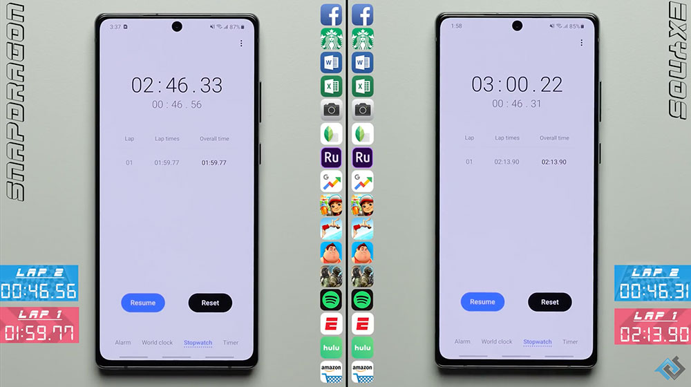 การทดสอบรอบที่ 2 เป็นการทดสอบการทำงานแบบเบื้องหลัง ซึ่งชิปเซ็ต Qualcomm Snapdragon 865+ ที่ออกสตาร์ทดีกว่าในรอบแรก ปิดฉากในรอบที่ 2 ใช้เวลาไป 0.46.56 นาที ใกล้เคียงกับ Exynos 990 ที่ใช้เวลาไป 0.46.31 นาที แต่รอบแรก Qualcomm Snapdragon 865+ ทำเวลาดีกว่า รวม 2 รอบใช้เวลาไปทั้งสิ้น 02.46.33 นาที ส่วน Exynos 990 ใช้เวลาไปทั้งสิ้น 03.00.22 นาที