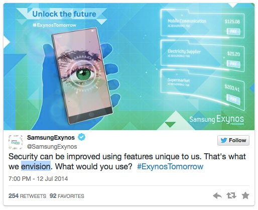 [16-กรกฏาคม-2557] ทาง @SamsungExynos ได้ทวีตข้อความที่น่าสนใจ เกี่ยวกับ Galaxy Note 4 ว่า จะมาพร้อมกับ เซ็นเซอร์สแกนม่านตาครับ