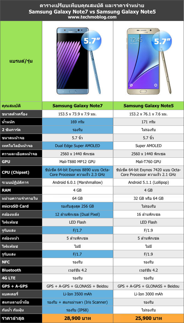 Samsung Galaxy Note 5 ได้เปิดตัวออกมาเป็นเวลากว่า 1 ปีแล้ว ช่วงเวลาที่ผ่านมา Samsung ได้พัฒนาต่อยอดสมาร์ทโฟนตระกูล Note ไปในด้านใดบ้าง และไปได้ไกลเพียงใด วันนี้ทีมงาน Techmoblog จึงนำสเปคของ Samsung Galaxy Note 7 และ Samsung Galaxy Note 5 มาเปรียบเทียบให้เห็นความแตกต่างกันชัดๆ ไปเลยครับ