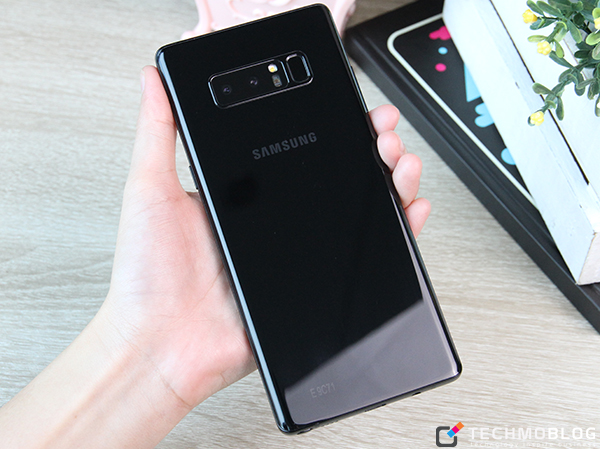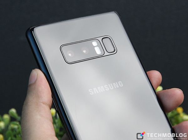 โดยที่ด้านบนมีการติดตั้งฟีเจอร์ชูโรงอย่างระบบกล้องคู่ (Dual-Camera) ความละเอียด 12 + 12 ล้านพิกเซล ซึ่ง Galaxy Note 8 นับว่าเป็นมือถือรุ่นแรกของ Samsung ที่ได้ใช้กล้องคู่เลยทีเดียว ถัดมาเป็นไฟแฟลชแบบ LED, เซ็นเซอร์วัดอัตราการเต้นของหัวใจ และเซ็นเซอร์สแกนลายนิ้วมือ ซึ่งการที่ Samsung ได้ย้ายตำแหน่งปุ่มสแกนลายนิ้วมือใหม่ต่างจากรุ่น Galaxy S8 ก็เพื่อให้ผู้ใช้งานสามารถสแกนลายนิ้วมือได้โดยที่ไม่พลาดไปโดนเลนส์กล้องหลังนั่นเอง