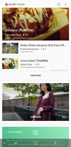 จากหน้าโฮมสกรีน หากปัดไปด้านซ้ายจะพบกับ Bixby Home ซึ่งเป็นหน้าที่แสดงข้อมูลจากแอปพลิเคชันต่างๆ ที่ Bixby รองรับ เช่น สภาพอากาศ หรือข่าวสาร ทำให้เราไม่ต้องไปไล่เปิดดูทีละแอปนั่นเอง